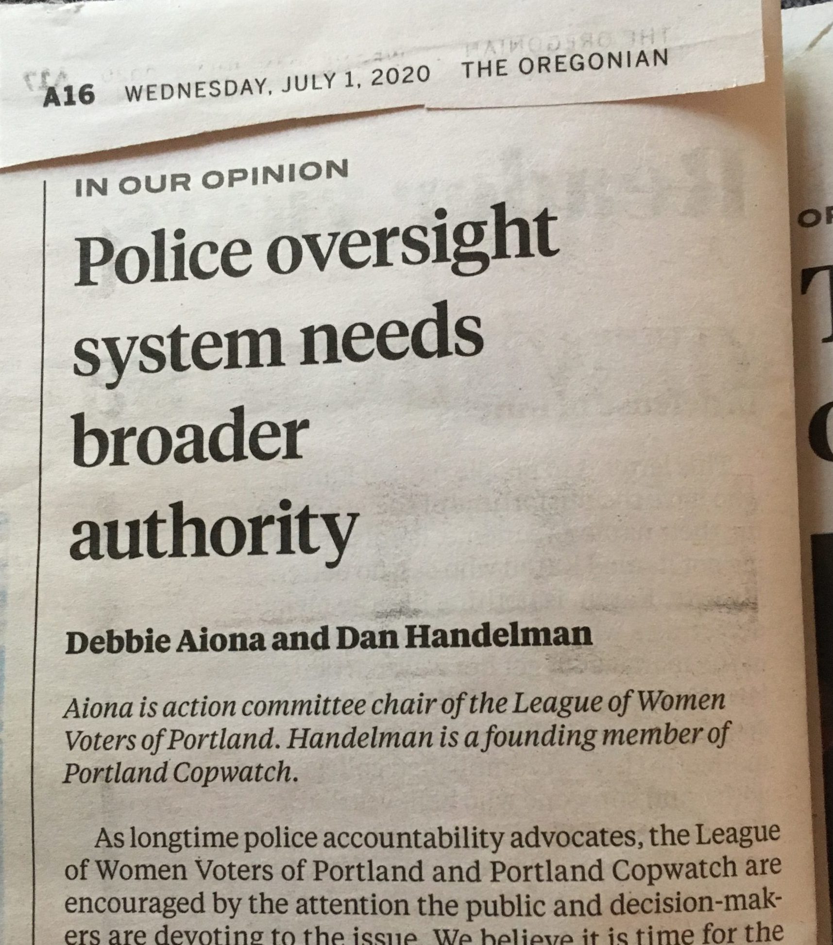 On July 1, 2020, The Oregonian published an “IN OUR OPINION” piece by LWV of Portland Action Chair, Debbie Aiona, and founding member of Portland Copwatch, Dan Handelman. The Portland League and Portland Copwatch have been working to improve police oversight for decades. In their Opinion article, they recommended changes to make the system more effective. These would give more power to Portland’s Independent Police Review (IPR) office and its Citizens Review Committee (CRC).