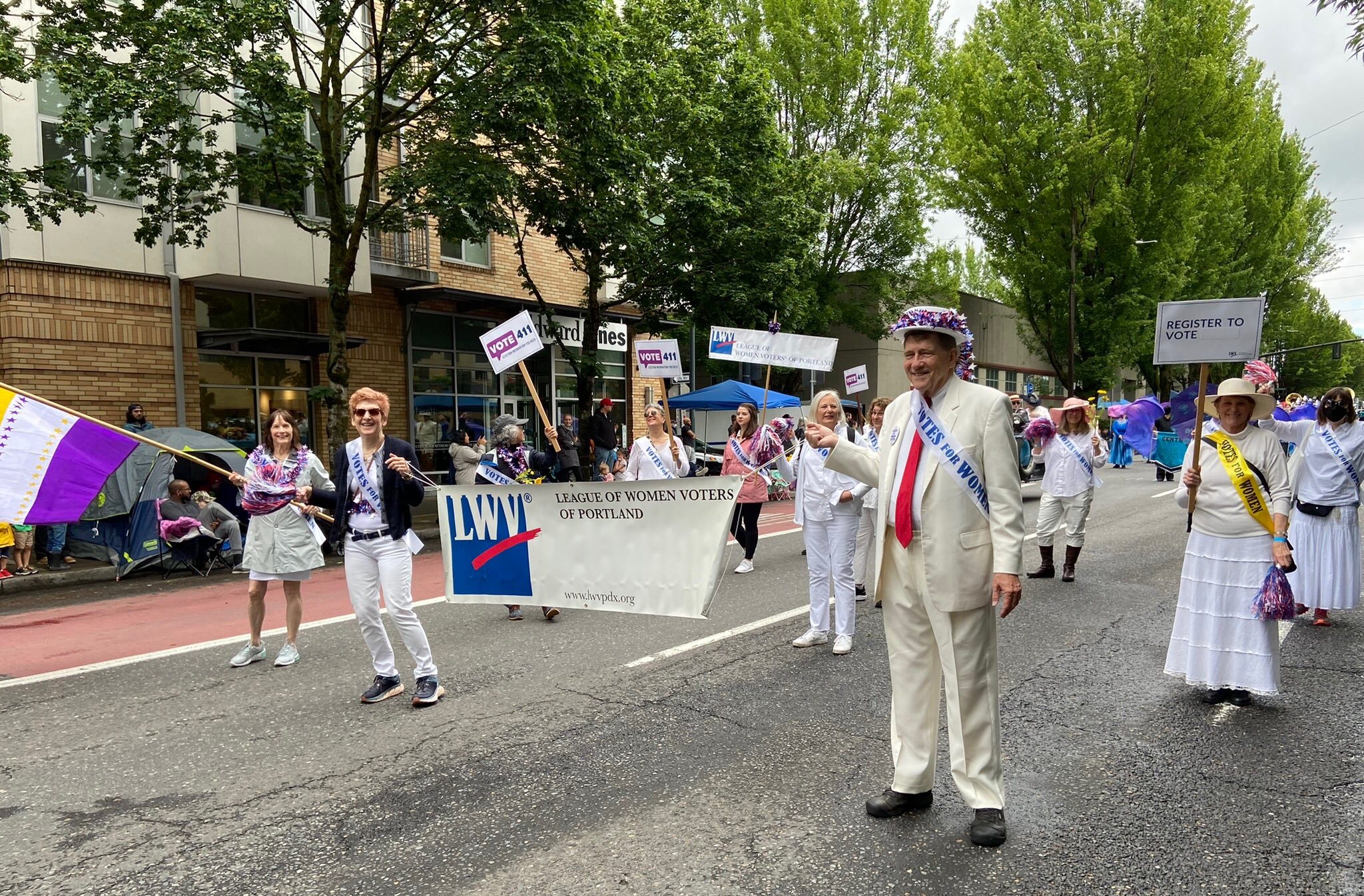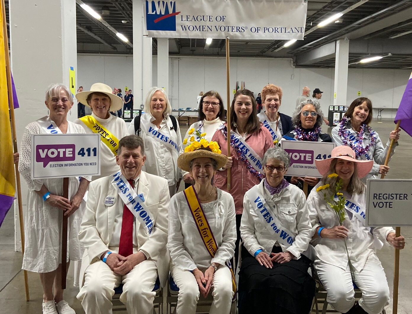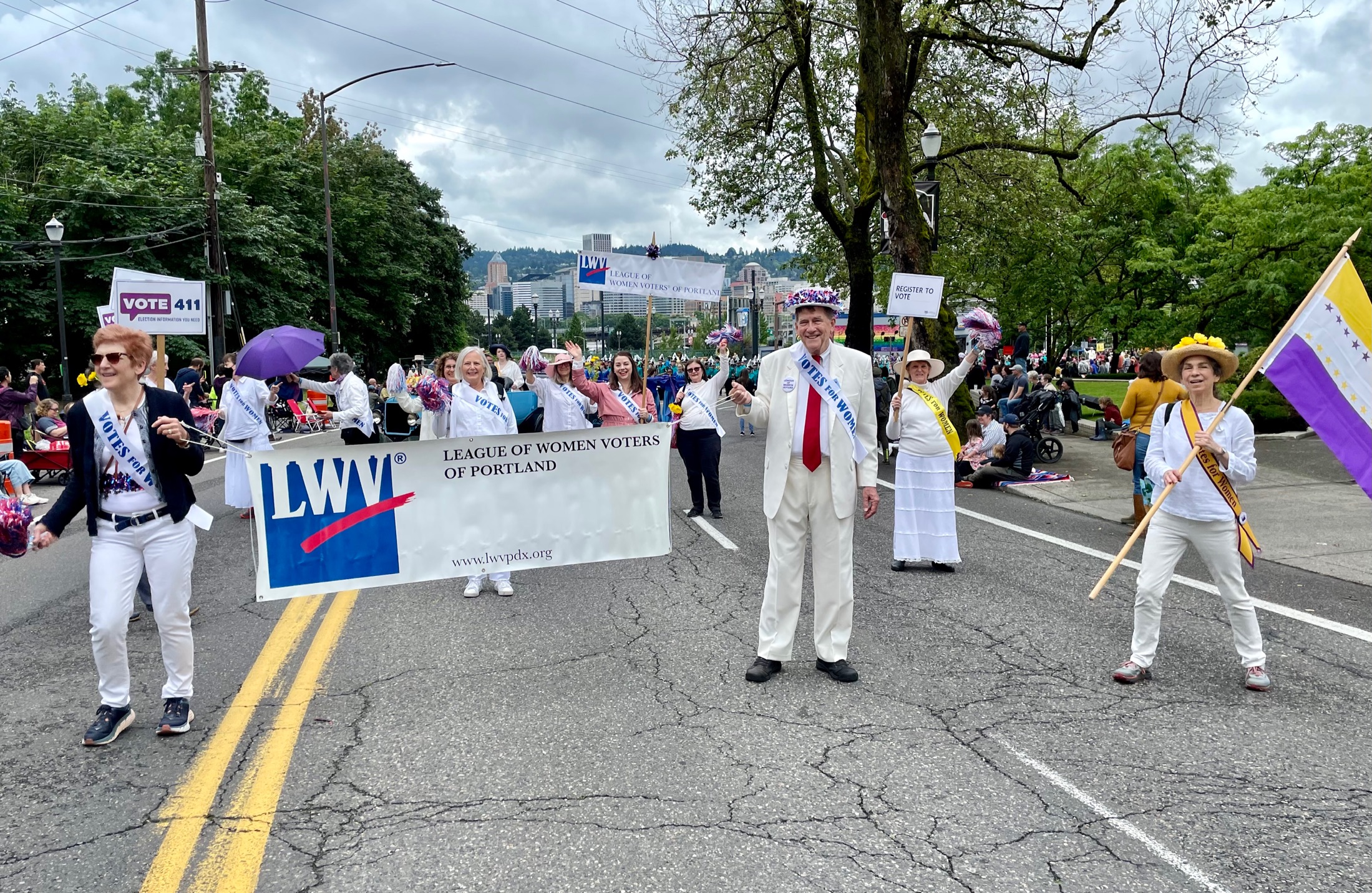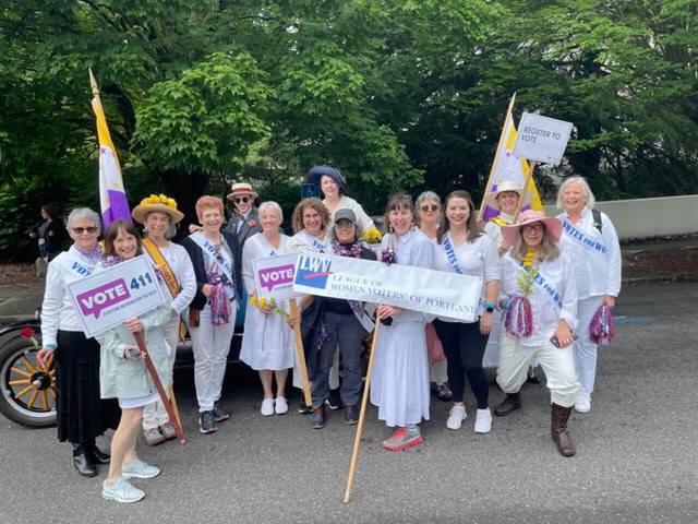 On June 11, the League of Women Voters participated as a Special Entry in the Rose Festival Grand Floral Parade . League members from Portland and Clackamas County and friends were celebrating the 102nd anniversary of the 19th Amendment granting American women the right to vote. They dressed in white – the color worn by women suffragists more than a century ago – and wore “Votes for Women” sashes. Since its founding, the League of Women Voters has worked to promote democracy and improve governmental policies. Information on this website demonstrates the many ways the League continues to support voters and advocate for better policies. 2022 is also the 102nd anniversary of the founding of the League of Women Voters.