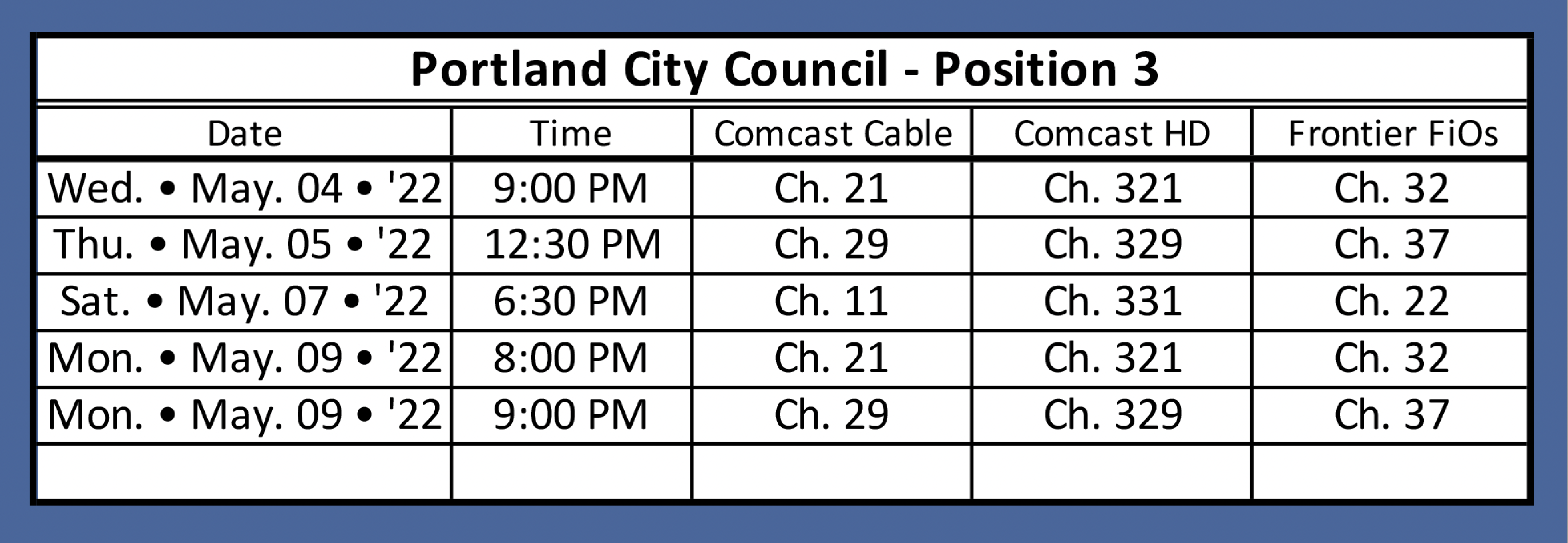 The videos also will be posted on Vote411.org. Below are the replay dates for these forums on public access TV channels.