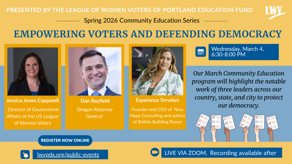 Since the beginning of the pandemic, most of our Community Education programs have been conducted by Zoom. However, our October 2021 event was a very dynamic demonstration, held in person with appropriate precautions. Here are the public events we presented in the fall of 2021 and spring of 2022. Podcasts of these events are on our Buzzsprout webpage here: https://lwvpdxpodcasts.buzzsprout.com