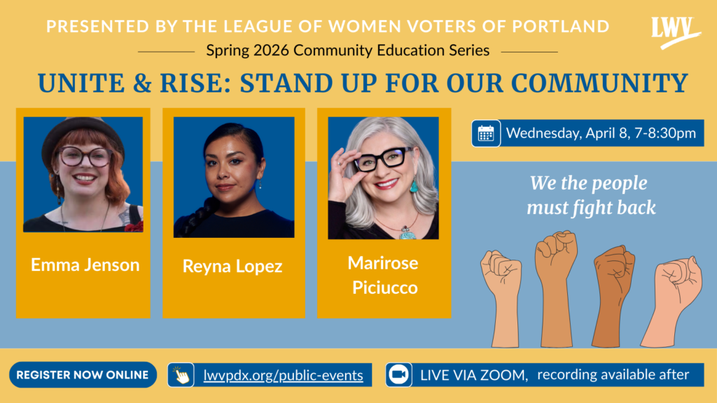 Funding for the production is provided by the League of Women Voters of Portland and funded by the Carol and Velma Saling Foundation.